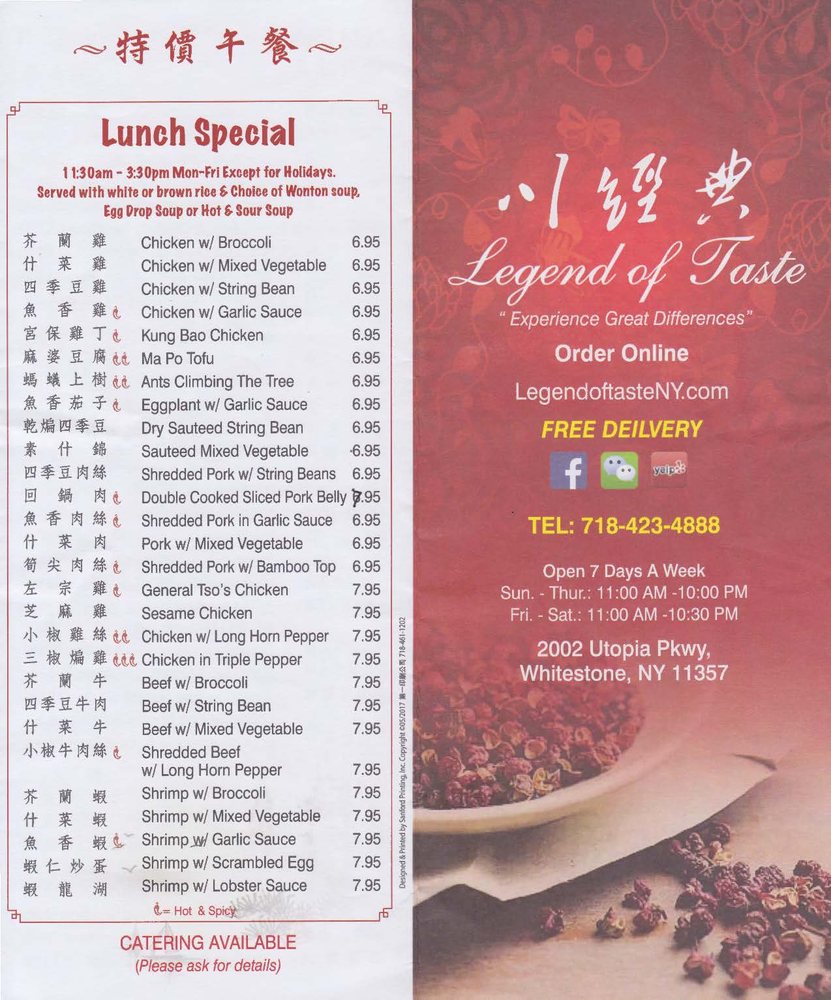 Welcome to Legend of Taste, where authentic Sichuan flavors meet a welcoming ambiance at 2002 Utopia Pkwy, Whitestone, NY. This delightful restaurant offers an array of dishes that cater to all taste buds, featuring many vegetarian options and spicy highlights like the Ants Climbing the Tree and General Tso's Tofu.